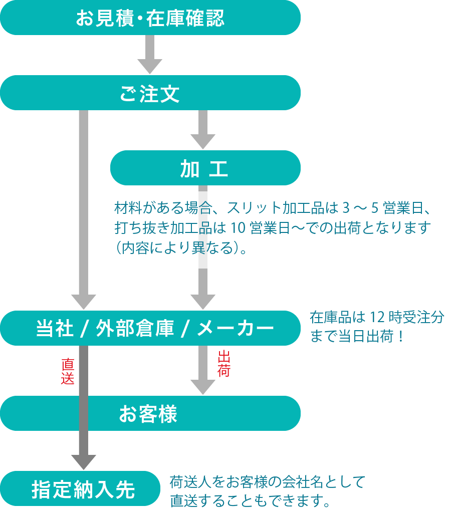 当社が創業時より取り組んできたことは、その時代におけるお客様の要望に応えること。お客様が在庫を減らすならば、当社は在庫を増やしてその機能を担い、供給が不安定であれば、先行発注をしてお客様の納期遅延リスクを軽減し、加工が必要であれば、自社工場を持ち、常に挑戦してきました。